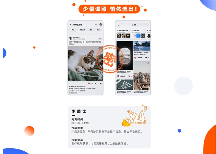 官方公布了WeZone的預覽圖,從中可以看到用戶分享的內容可以點贊、評論和轉發,還可關注內容發布者。