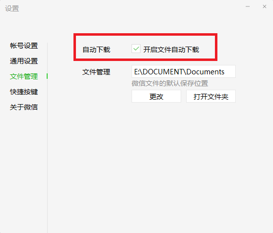 功能設置方面,可以設定將聊天中的語音消息自動轉為文字(默認關閉),可以設定收到的文件是否自動下載(默認開啟),建議后一項設為關閉,以節省本地電腦空間,此時收到的文件旁邊會出現一個下載標記,點擊才會存到本地。