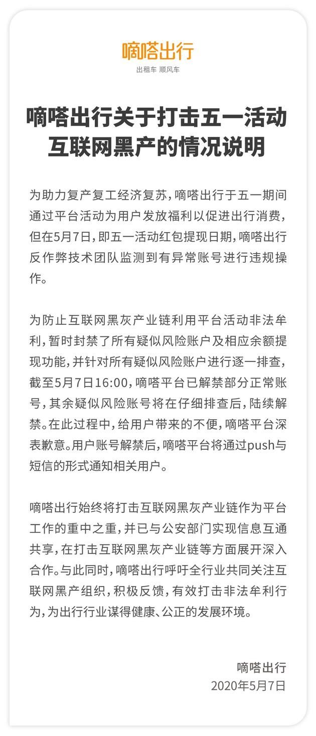 嘀嗒出行現(xiàn)已發(fā)布《關(guān)于打擊五一活動(dòng)互聯(lián)網(wǎng)黑產(chǎn)的情況說(shuō)明》。