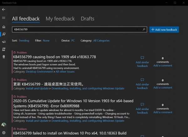 在微軟的論壇、Reddit和社交媒體上擁有不少關(guān)于Windows 10累積更新的問題,其中包括藍(lán)屏、停止響應(yīng)以及設(shè)備黑屏的問題。此外還有用戶報(bào)告存在Windows 10網(wǎng)絡(luò)適配器的問題,一些使用LTE調(diào)制解調(diào)器的PC可能無(wú)法上網(wǎng)。