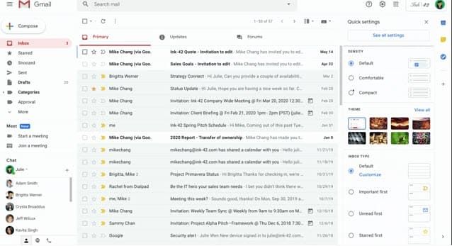 Google現(xiàn)在推出了一個新的快速設(shè)置菜單,讓用戶可以方便地對Gmail的郵件界面進(jìn)行更改,包括更改收件箱類型、密度、閱讀窗格位置還是主題。在這之前,要更改Gmail收件箱類型,用戶需要訪問其設(shè)置界面,而要改變Gmail界面的顯示密度或主題,則需要點擊齒輪圖標(biāo)并選擇相關(guān)選項。