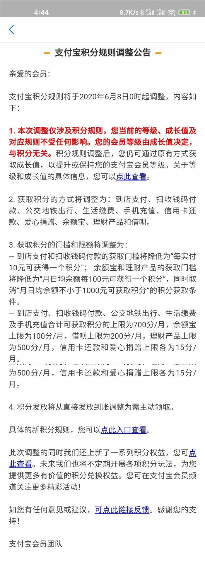 獲取積分的方式調整為:到店支付、掃收錢碼付款、公交地鐵出行、生活繳費、手機充值、信用卡還款、愛心捐贈、余額寶、理財產品和借唄。而積分發放將從直接發放到賬調整為需主動領取。