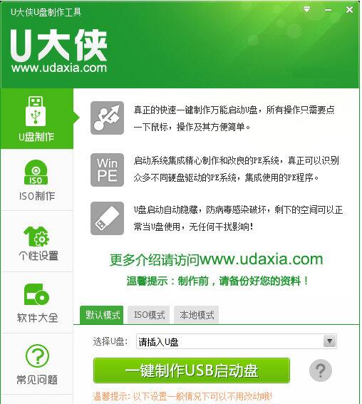 U大俠一鍵u盤裝系統(tǒng)工具是一款以打造快速制作萬能啟動U盤,一鍵解決系統(tǒng)問題的電 腦重裝好幫手!是裝系統(tǒng)和維護電腦不可或缺的工具,支持GHOST與原版系統(tǒng)安裝,方便 快捷,還兼容多種機型。