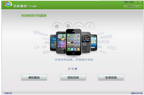 手機搬家(個人版)手機搬家是一款手機數據備份與轉移的PC軟件。使用不限手機品牌和型號,支持手機數據跨品牌,支持手機超過1000款:諾基亞、apple 、三星、 摩托羅拉、 htc、中興、華為、酷派、聯想、小米、黑莓等;支持跨操作系統(tǒng)轉移,包括iPhone iOs 、Android、Symbian、MTK、黑莓等各平臺智能及非智能手機。 功能介紹 1.1雙機互導:將A手機的通訊錄轉移到B手機中。當你換新手機時,最苦惱的就是如何到號碼了,通過雙機互導功能,可以一鍵將A手機的號碼(通訊錄)轉移到B手機中,方便快捷的同時;如果有兩款手機同時使用,也可以通過雙機互導功能,同步兩款手機上的通訊錄。 1.2單機備份:將手機通訊錄保存到電腦中,并可將其恢復到手機中。通過備份功能我們可以完整地保存手機通訊錄,通過恢復功能我們能夠輕松找回通訊錄,使用不限手機品牌和型號。 1.3安卓應用:提供最熱最新的安卓應用免費下載安裝。我們?yōu)槟峁┝俗顭嶙钚碌母咂焚|安卓應用,均可免費安裝到您的安卓手機中。 產品特點 2.1支持強大:支持iOS、Android、Symbian、MTK等手機操作系統(tǒng),支持蘋果、HTC、諾基亞、三星、摩托羅拉等大部分手機品牌。 2.2操作簡單:一鍵式轉移,只需點擊一下,資料輕松轉移。 2.3轉移快速:通訊錄轉移可達到50條/秒。 3. 配置要求操作系統(tǒng):windows 7或xp內存:256 MB或更高硬盤:1 G或更高顯卡:顯存128 M或更高網絡:可用的有線或無線網絡。