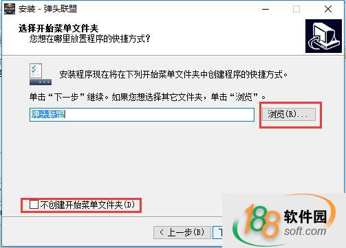 5、點(diǎn)擊“瀏覽”選擇開(kāi)始菜單文件夾,或者勾選不創(chuàng)建,然后點(diǎn)擊“下一步”
