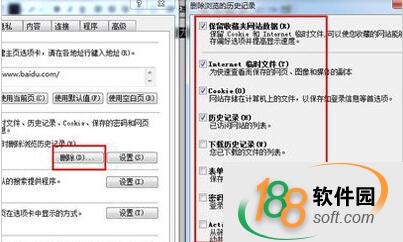 清理IE緩存:在開始菜單點擊【控制面板】,選擇【Internet選項】,切換到【常規】選項卡,點擊【瀏覽歷史記錄】欄中的【刪除】按鈕,勾選如圖所示,選擇后點擊【刪除】命令