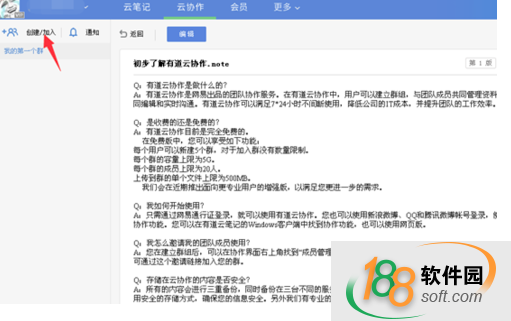 3、在進入云協作選項管理窗口后,我們找到并點擊下方的”創建/加入’按鈕。