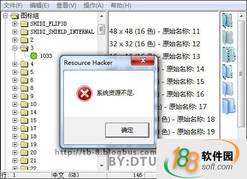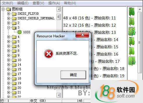 6、接著點擊對應文件夾“3”的那個小"+"符號拉開,選中"1033"后 右邊的預覽框就會顯示出圖標的樣式。 (注意:此時會彈出一個錯誤的提示框,我們確定掉即可。后面才解釋)