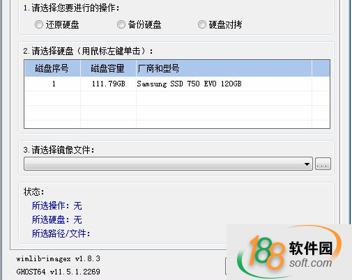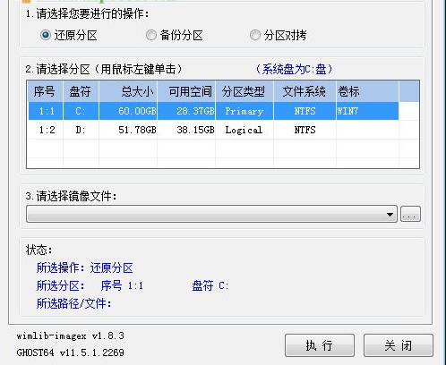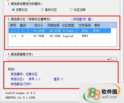 2、選擇您需要進(jìn)行使用的分區(qū),包括了序號(hào)、盤符、總大小、可用空間、文件系統(tǒng)、可對(duì)您需要使用的鏡像文件進(jìn)行選擇、軟件的狀態(tài)查看等;