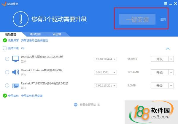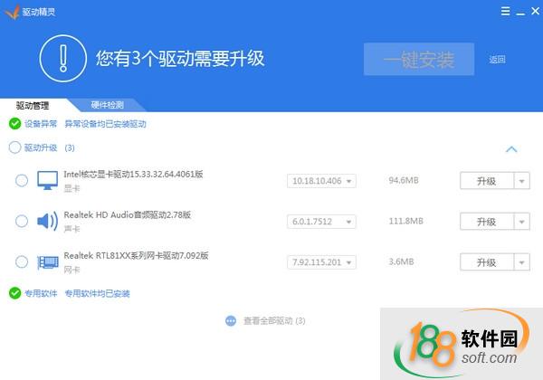 3、可以看到檢測(cè)出,所有的軟件都已經(jīng)安裝,有三個(gè)驅(qū)動(dòng)需要升級(jí),
