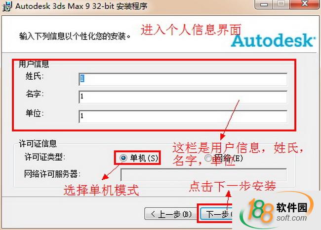 在個人安裝信息界面,我們看到了用戶信息和許可證信息:用戶信息可以根據填寫數字或是字母也可以。許可證信息我們選擇單機模式。點擊下一步繼續安裝。
