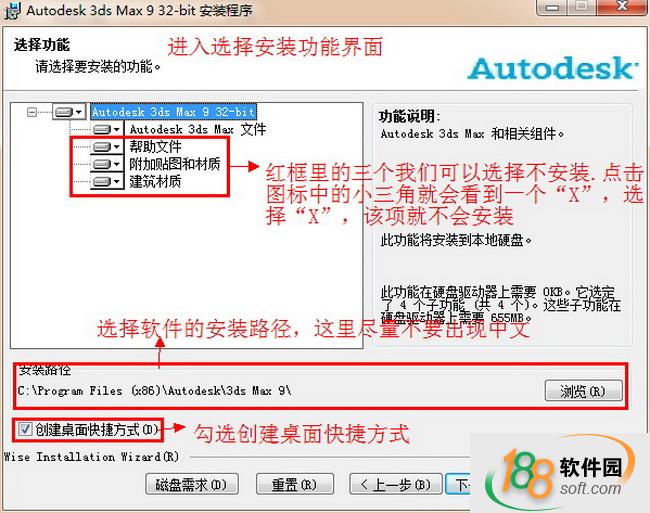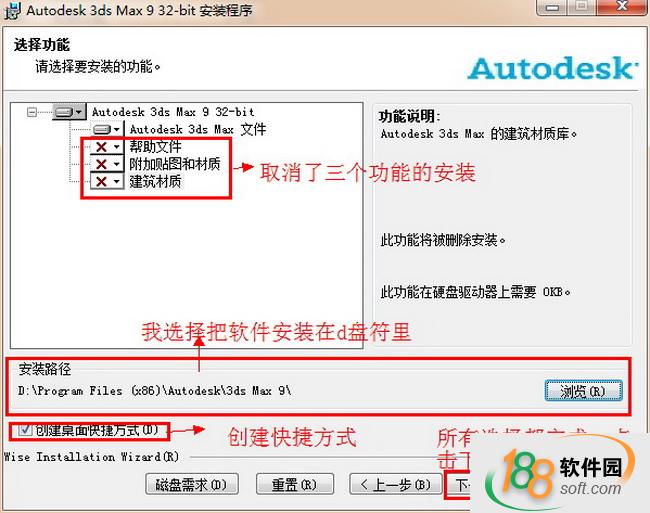 在這個界面中我們看到了選擇安裝程序功能和安裝3dmax9.0 32位 中文版路徑;我們可以看到選擇安裝程序功能這里面有三個插件我們是可以選擇不安裝所以不選取。