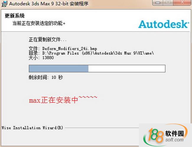 所有的配置跟路徑都選擇好了,下面進入了正式安裝,3dmax9.0 32位 中文版正在安裝中。