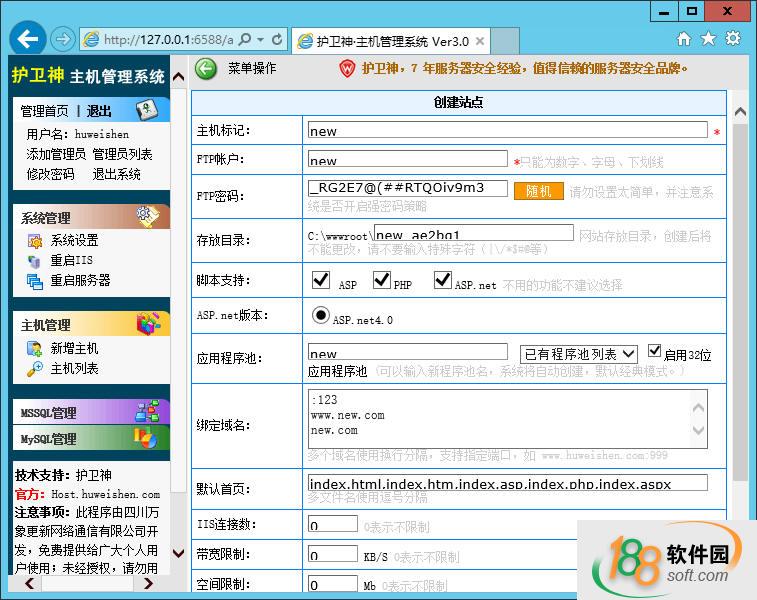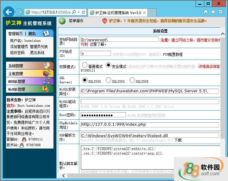 護衛神.主機管理系統 是一套為方便廣大用戶管理服務器而開發的軟件,支持開設主機、SQL Server2000/2005、MySQL。