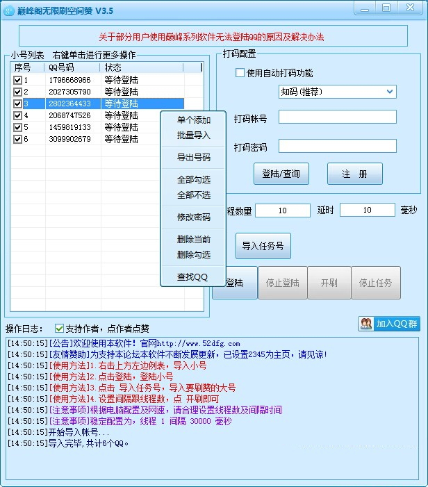 巔峰閣無限刷空間贊軟件是一款由巔峰閣社區推出的QQ空間自動刷贊工具。巔峰閣無限刷空間贊軟件功能強大,使用方便,能幫助用戶一鍵快速刷空間贊,讓空間人氣一路飆升,讓你成為朋友中的人氣之王,需要的朋友快來下載吧。