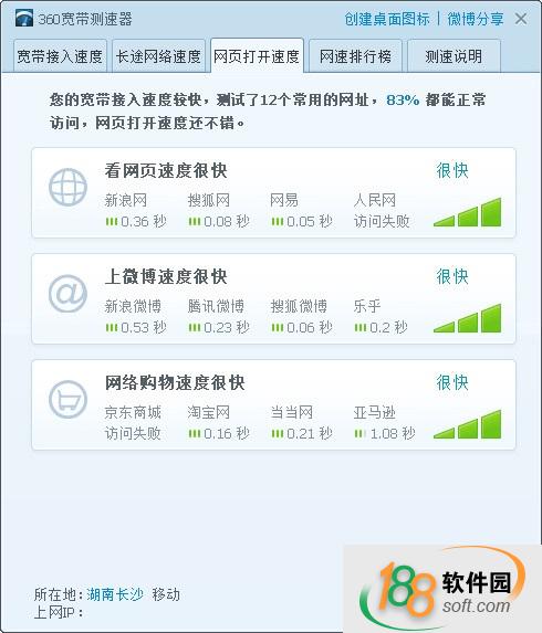 可測試寬帶接入速度、長途網絡速度、網頁打開速度,還有網速排行榜和測速說明