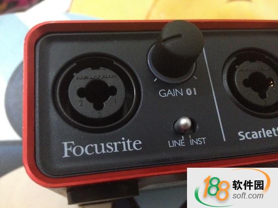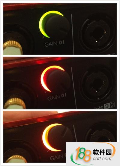 富克斯特(Focusrite) 2i2聲卡正面是2個XLR/TRS混合輸入接口,每個都可同時連接XLR卡儂話筒、大兩芯吉他/貝司和大三芯線路信號,由于2i2上還有48V幻相供電按鈕,所以它也可以連接電容話筒(如圖2)。兩個接口旁邊的增益旋鈕很有意思,它們周圍帶有一圈多彩LED燈,當發出綠色光的時候證明信號正常(至少不到-24dBFS),變成桔色表示快到極限了,紅色的話就提示你信號已經達到0dBFS了,爆音了(如圖3)!不過無法通過它來判斷出具體的電平,要是做成一圈多段LED燈就可以當電平表用了,那樣就更實用了。