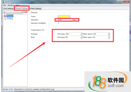 4、選擇“Filament”,選擇線材的顏色,以及線材的直徑為1.75MM。加熱頭的溫度設置,首層比其它層高10°,有利于第一次的附著