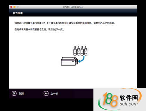 3、完成打印機(jī)填充墨水和安裝墨倉(cāng)之后,點(diǎn)擊下一步繼續(xù)。