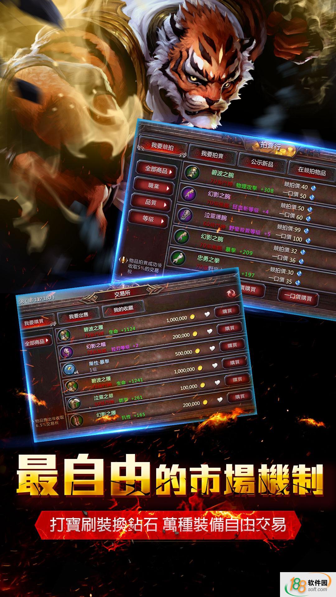 獨創鉆石拍賣行,金幣交易所,打寶刷裝換鉆石,萬種裝備自由交易,最自由的市場機制,讓你打寶換鉆越換越賺!不花錢也可成為戰力王者!