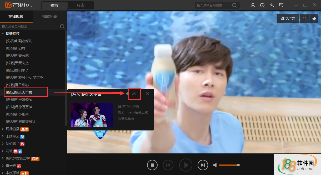 1.在下載之家下載安裝芒果TV客戶端最新版,打開后選擇要下載的視頻,小編以快樂大本營為例。鼠標移到要下載的節目上,會彈出一個框,然后再點星星右邊的下載按鈕。