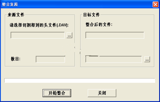 合并也是非常簡單,我們在把文件分割完成后,會產生一個DAV格式的頭文件以及我們分割成的小文件,我們只需在菜單中選擇整合復原,然后選擇那個dav頭文件,按“開始整合”按鈕就可自動進行合并了。