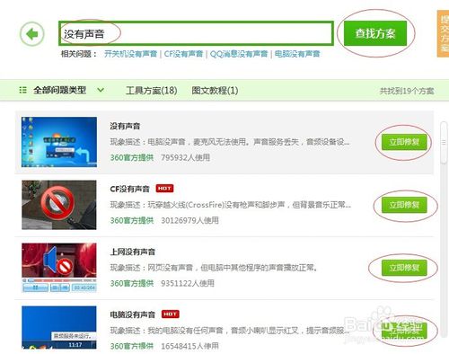 6、這里我們假設(shè)電腦沒(méi)有聲音,搜索出來(lái)以后可在當(dāng)前頁(yè)面下下拉,找到與當(dāng)下情況描述相符合的問(wèn)題解決辦法,選擇修復(fù)。