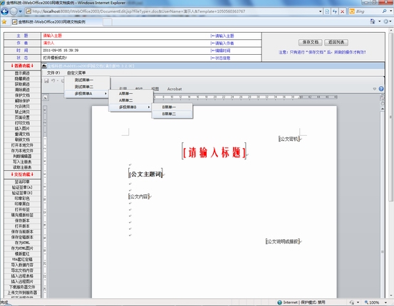 iWebOffice2006文檔控件,支持直接在IE瀏覽器中對文檔進行全文批注,具有精確手寫、全屏顯示、真筆真跡、一鍵批注、一鍵核稿、方便好用等特性。兼