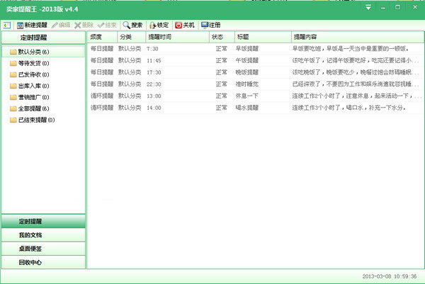 賣家提醒王是備忘客專為淘寶、拍拍等賣家專門定制的一款適合賣家使用的管家提醒軟件。有了賣家提醒王,您可從繁瑣的工作中脫身,輕松打理店鋪,及時發貨入庫,收入翻翻。 功能介紹 1.提醒發貨、簽收及出入庫