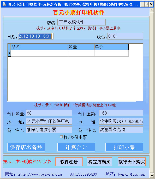百元小票打印機軟件主要用于各類店鋪打印小票使用,錄入什么,就打印什么,打印的小票時全英文的,由自己靈活錄入和修改打印內容,支持各種POS小票打印機。 更新日志 增加了計算功能 完善了小