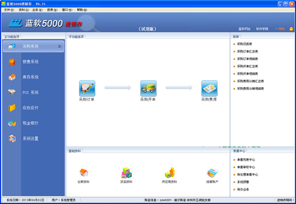 藍軟5000進銷存專為小型企業量身設計,全方位管理企業采購、銷售、庫存、收款、付款各項業務、快速幫助用戶打造一個高效易用進銷存管理平臺。 主要模塊 采購管理、銷售管理、庫存管理