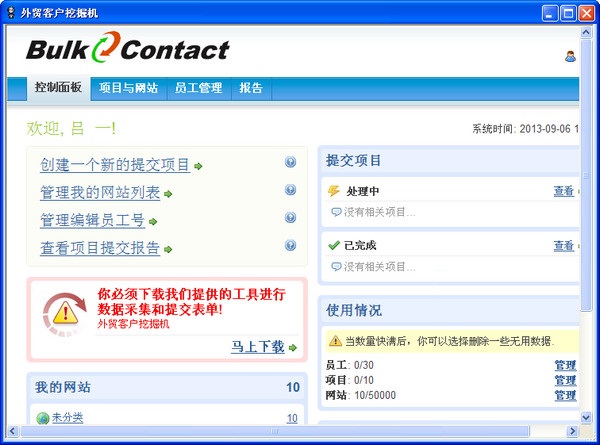 外貿客戶挖掘機是一款可以收集客戶聯系資料,發送廣告內容將變的簡單一體化,鼠標點點即可完成的軟件工具。 功能介紹 管理便捷 - 公司賬號登陸后即可管理網站列表,項目列表,員工列表,項