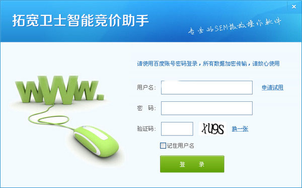 拓寬衛士百度智能競價助手是深圳拓寬科技有限公司基于百度API開放平臺,自主研發一款專業的百度推廣競價管理軟件,分析百度核心關鍵,通過專業的排名算法讓用戶以最低的出價獲得最好的排名,提高用戶的網絡營銷的
