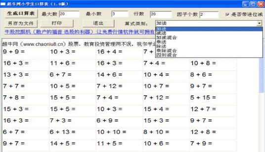 小學生口算表,讓你自己東西給您的孩子制作任意四則運算口表,從每日一練中逐步提升您孩子的筆算和口算和心算能力,是教師教學和學生提高素質的實用軟件。