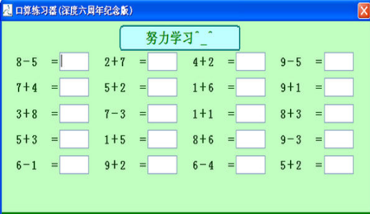 口算練習器一次能隨機生成20條計算題,可設置生成0到99之間的數(shù)字互相加減的算術題,軟件采用倒計時交卷方式,一定時間內算完算對的小朋友將獲得滿分。 口算練習器能很快提高口算與心算能力
