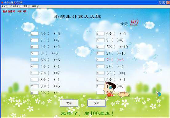 小學(xué)生計(jì)算天天練適用于學(xué)前班、小學(xué)生口算練習(xí)。系統(tǒng)提供屏幕練習(xí)、制作口算題卡打印練習(xí)(保護(hù)兒童視力)。
