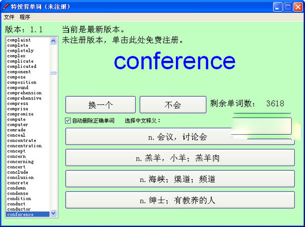特投背單詞是一款簡易的背單詞程序,內置大學英語四級詞匯3600個,軟件顯示未注冊,但可以免費注冊,有需要的朋友可以試試。