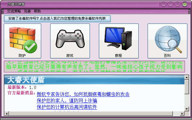 本程序已通過360軟件安全認證,無毒、無插件大睿天使盾.DaruiAngelShield提示:需要安裝AdobeFlashPlayer10或更高版本四大功能模塊*防系統關鍵