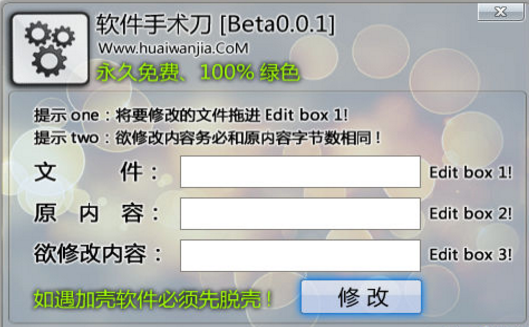 軟件手術刀下載,修改exe文件內容的工具。將修改的文件拖進EDIT BOX1,將需要修改內容的字節輸入EDIT BOX12,注意與與原內容字節數保持一致。