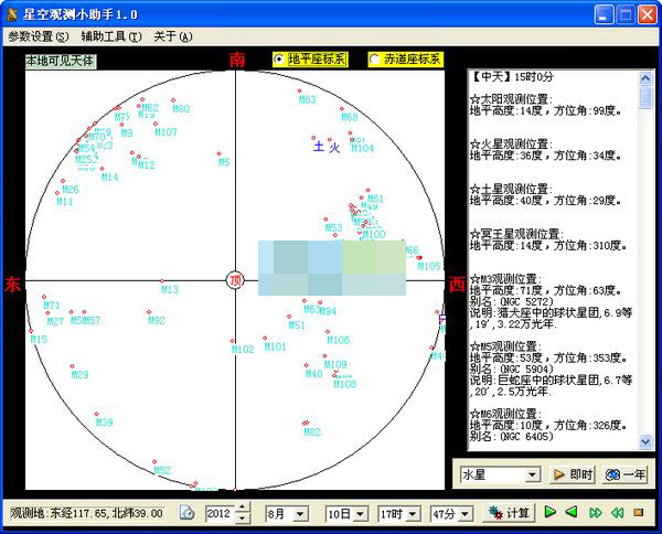 星空觀測小助手能求得九大行星每時每刻的位置、距離,可以以赤道和地平兩種方式查看,還能知道當前可觀測的變星、流星群、梅西耶天體的位置和簡介,并且這個軟件完全免費且綠色。 現在天空有什么星體可觀測呢?