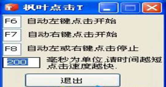 楓葉鼠標自動點擊體積小不用安裝的軟件,楓葉鼠標自動點擊放開你的雙手! 支持:鼠標左鍵與右鍵自動點擊,并支持熱鍵f6,按下左鍵自動點擊;如要自動鼠標右鍵點擊,可按下f7;另定義f8為自動停止點鍵,還支持