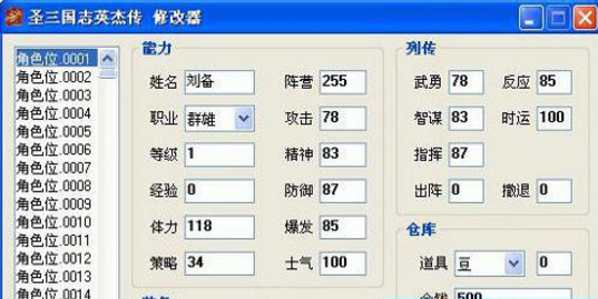 《圣三國志英杰傳》角色屬性修改器 《圣三國志英杰傳》是一款以三國歷史為題材的戰棋類游戲,簡單的游戲模式,豐富的游戲玩法,讓這個看似單調的作品變得豐富起來,也許在每一次派兵抗戰中,你都會發現一些問題,