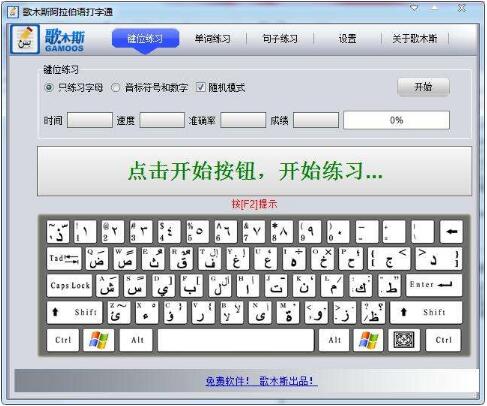歌木斯阿拉伯語打字通是一款歌木斯網研發的打字練習軟件免費軟件,主要有一下特點: 1.包括鍵位練習,單詞練習,句子練習; 2.內置輸入法轉換程序,無需安裝任何阿拉伯語輸入法(101和10