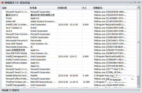卸載助手是一款簡單的軟件卸載工具,直接運行就會顯示你已安裝的軟件,右鍵選擇要卸載的軟件即可,免去大家去空間面板找程序和功能的麻煩。