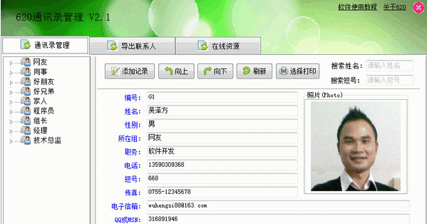 620通訊錄管理輕松幫助用戶記錄管理聯(lián)系人及聯(lián)系方式,可打印記錄同時也可把 通訊錄數(shù)據(jù)導(dǎo)出為Excel、Txt、Hta三種格式文件,方便數(shù)據(jù)交換。分類所有聯(lián)系人以樹形結(jié)構(gòu)列出,可插入照片,查看方便、一