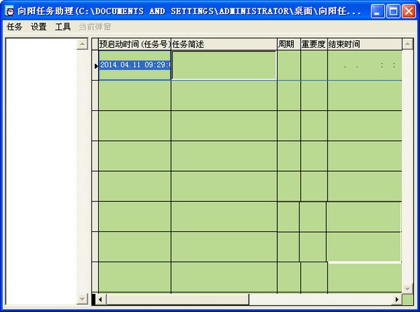 向陽任務助理可以登記未來需要執行的工作,到時彈出任務窗口。對執行的工作進行編緝記錄。可雙擊任務列表中的任務,彈出相應任務窗口以記錄有關信息。每項工作記錄包括的字段:開始時間/任務簡述/周期/重要度/輸